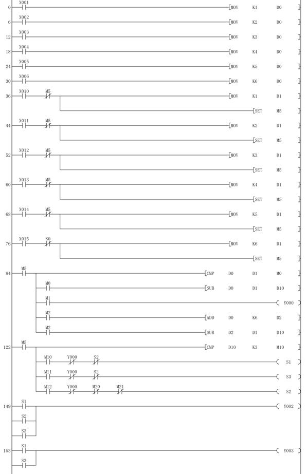 104 MRD 105 AND M2 106 ADD D0 K6 D2 113 MPP 114 AND M2 115 SUB D2 D1 D10 122 LD M5 123 CMP D10 K3 M10 130 MPS 131 AND M10 132 ANI Y000 133 ANI S2 134 OUT S1 136 MRD 137 AND M11 138 ANI Y000 139 ANI S2 140 OUT S3 142 MPP 143 AND M12 144 ANI Y000 145 ANI M20 |