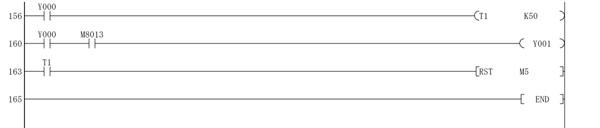 146 ANI M21 147 OUT S2 149 LD S1 150 OR S2 151 OR S3 152 OUT Y002 153 LD S1 154 OR S3 155 OUT Y003 156 LD Y000 160 LD Y000 161 AND M8013 162 OUT Y001 163 LD T1 164 RST M5 165 END |